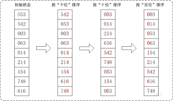根据思路分析,每一趟的执行流程如下图所 示: 通过基数排序对数组{53, 3, 542, 748, 14, 214, 154, 63, 616}: