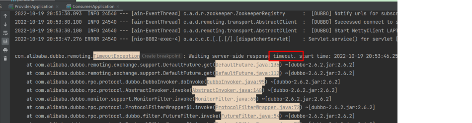 这里提示超时了,这是因为dubbo默认的超时时间为1秒,我们将进一步修改ProductServiceImpl.java,设置超时