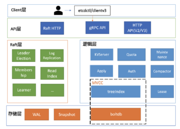 • 功能逻辑层: etcd核心特性实现层,如典型的KVServer模块、MVCC模块、 Auth鉴权模块、Lease租约模块、Compactor压缩模块等,其中MVCC模块主要由treelndex模块和boltdb 模块组成。
