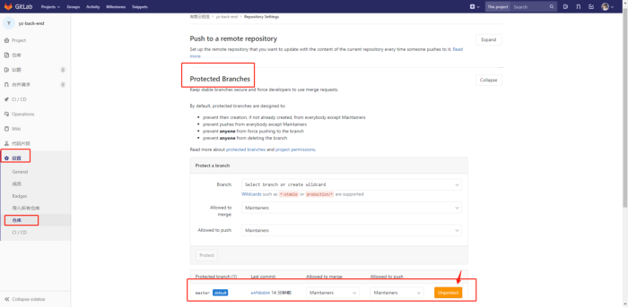 ***上面第三步如果强制推送失败,gitlab的话一般是因为开启了分支保护机制。可以在仓库的 设置页面,找到protect对应的标签下面,把保护分支暂时去除,过后再重新开启