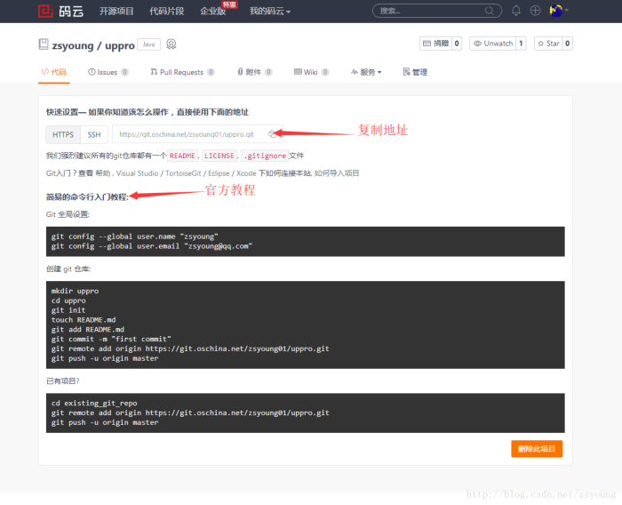 步骤2:复制远程项目地址 注意:此处码云官方已经给出上传项目方法,不过用的是命令行的形式,我们选择一种更加简单的方法。