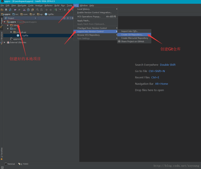 步骤3:创建好本地项目,点击VCS,按照图中指示给项目创建Git仓库。