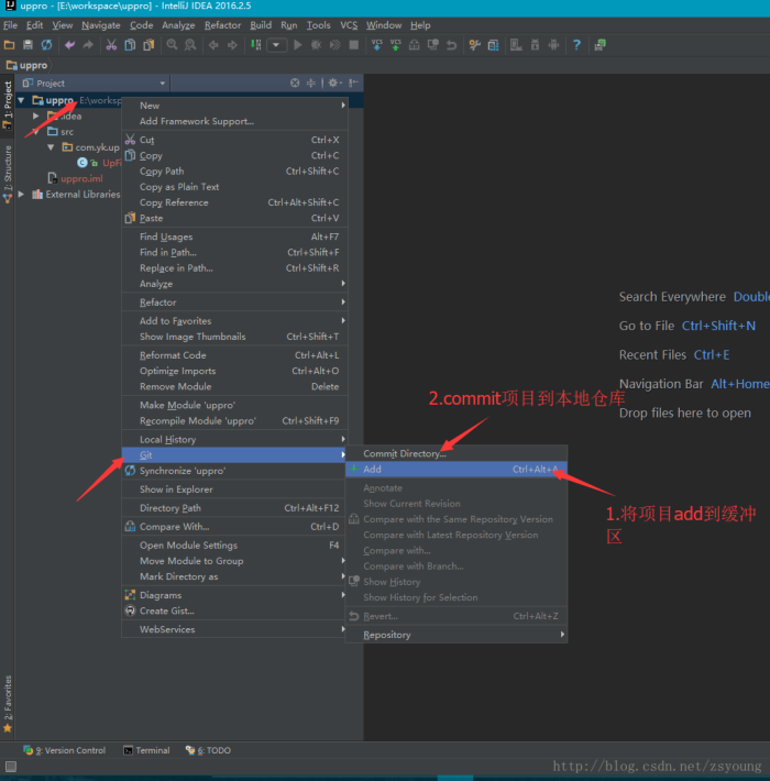 步骤5:选中项目名先将项目add到缓冲区,再commit到本地仓库。