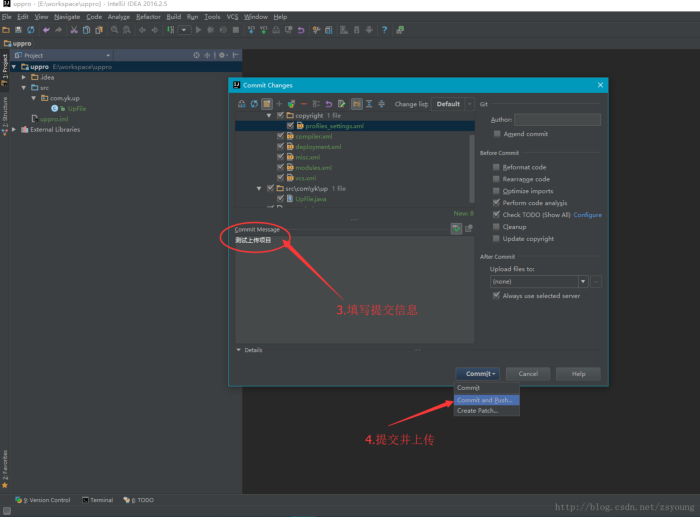 步骤6:点击Commit Directory后在弹出框中填写Commit Message(提交信息),然后选择Commit and Push。