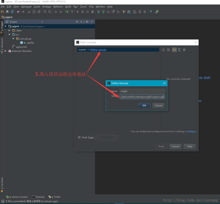 步骤7:在弹出的Push Commits对话框中点击“Define remote",填入步骤2中复制的远程项目地址。